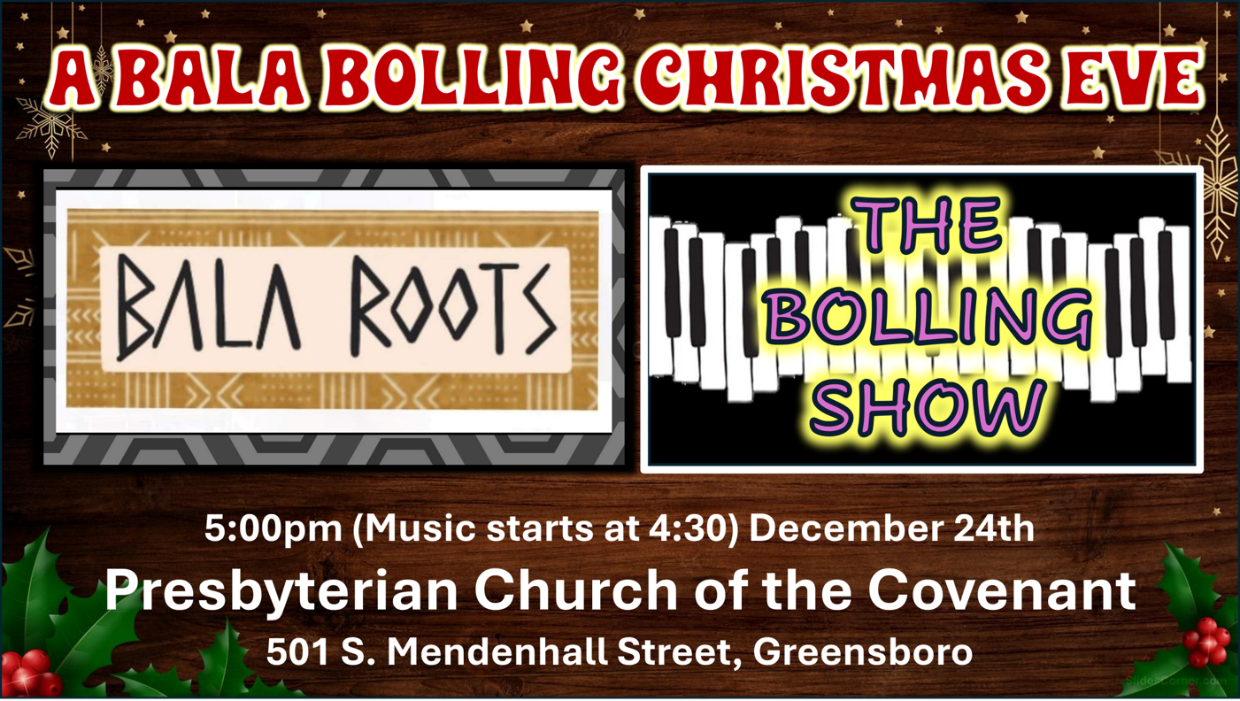 Both groups of amazing musicians from BalaRoots and the Bolling Show are going to be performing a spiritually crafted Christmas Eve Service at the historic and stunning Presbyterian Church of the Covenant at 501 S. Mendenhall St.