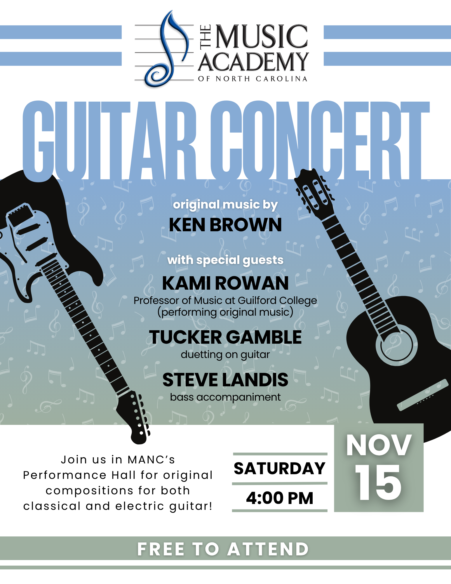 Come out and hear original compositions for classical and electric guitar by our Guitar Department Chair, Ken Brown, with special guests, Kami Rowan, Tucker Gamble, and Steve Landis.