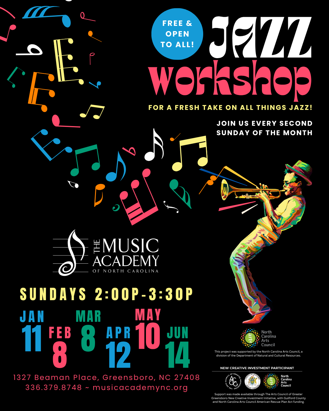 Every jazz workshop is unique, and all skill levels are welcome. So come jam with us or just pop in to listen!