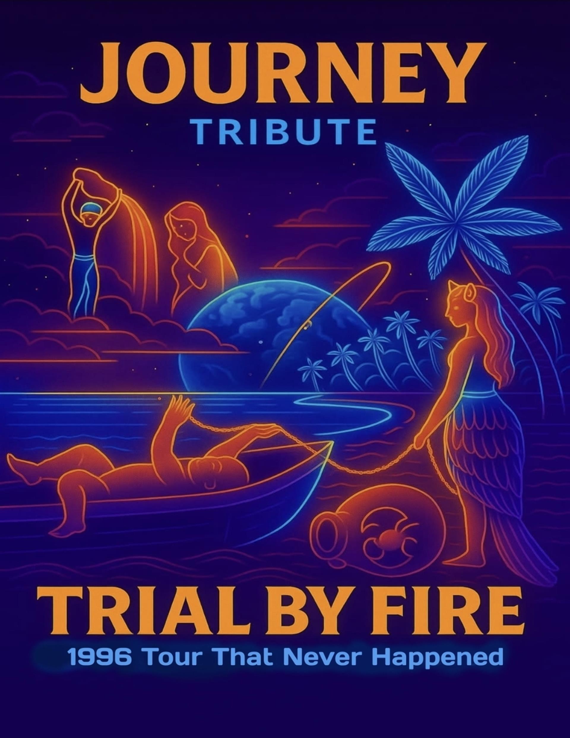 Experience the Journey Tour That Never Was!! Join Trial by Fire: Tribute to Journey as they bring to life the 1996 Trial by Fire Tour that never happened. In 1996, Journey reunited with legendary frontman Steve Perry and released Trial by Fire, their first album together in a decade. Plans for a worldwide tour were cut short when Perry suffered a devastating injury, leaving fans to wonder what could have been. Now, Trial by Fire pays homage to that lost moment in rock history. This unforgettable show imagines the setlist, energy, and spectacle of the tour Journey fans never got to see—packed with iconic hits from the Trial by Fire album and classics from the Steve Perry era. Don’t miss your chance to relive the magic and experience the Trial by Fire Tour as it might have been.