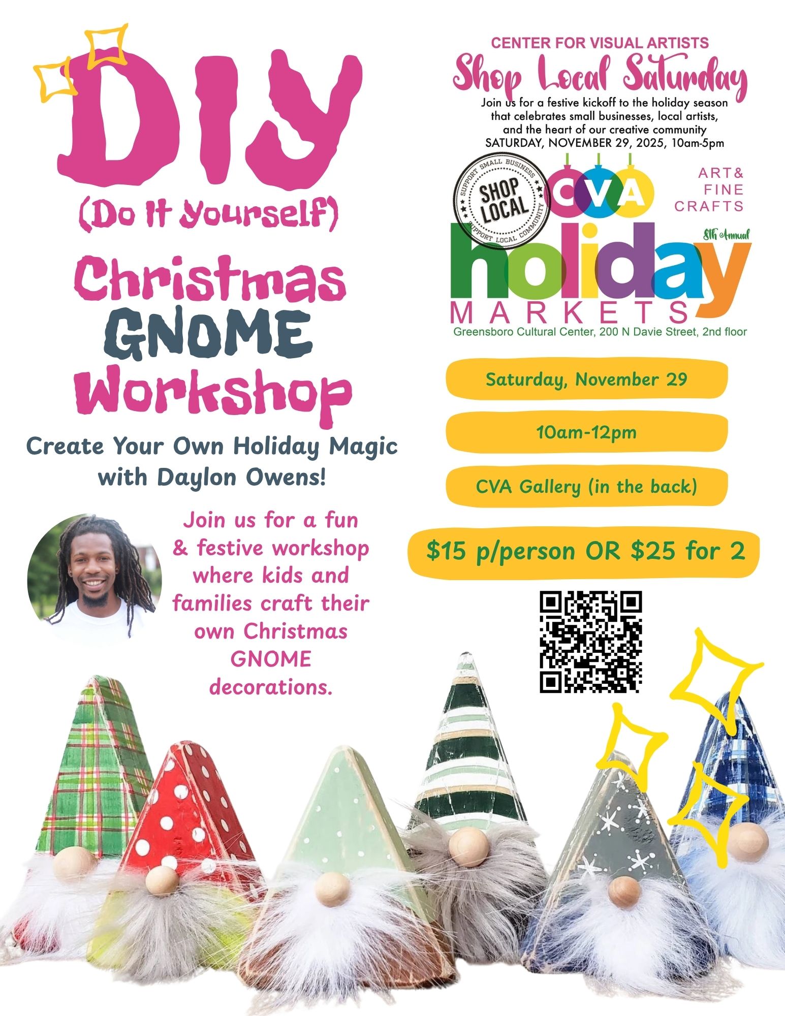 Join Daylon Owens for a DIY Christmas Gnome Workshop on Saturday November 29th from 10am-12pm. Create your own holiday magical gnome decorations in the CVA Gallery and while you are here, start your shopping with our SHOP LOCAL Holiday Market event featuring 10 artisan and craft booths!