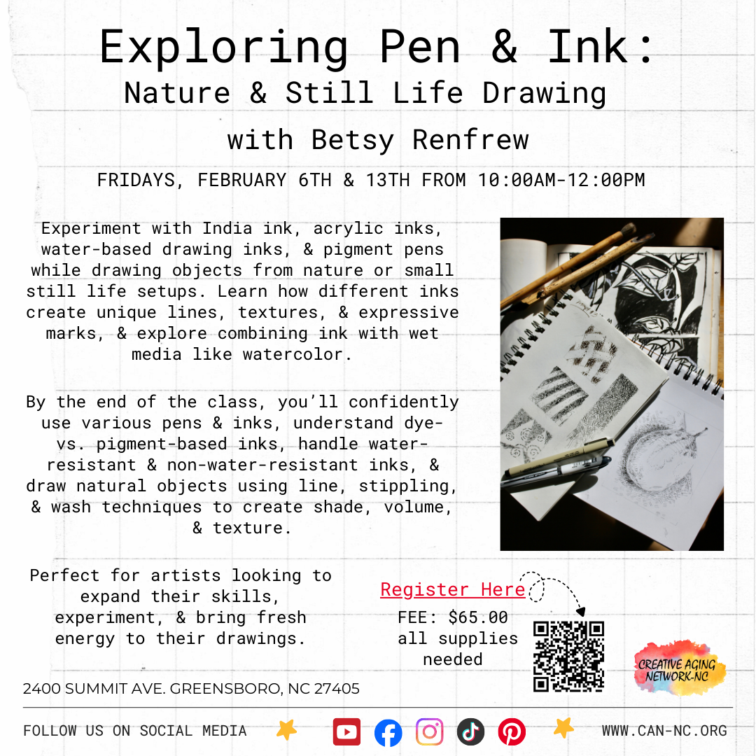 Explore the versatile world of pen and ink in this hands-on workshop! Experiment with India ink, acrylic inks, water-based drawing inks, and pigment inks while drawing objects from nature or small still life setups in your sketchbook or journal. Discover how different pens and inks create unique lines, textures, and expressive marks, and explore combining ink with wet media like watercolor or colored inks.