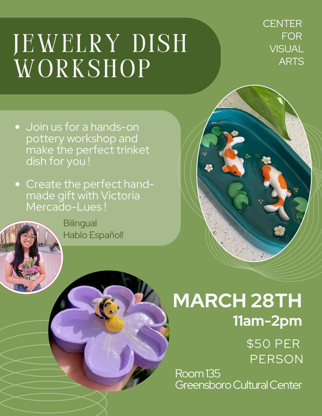Join Victoria Mercado‑Lues for a hands‑on pottery workshop where you’ll learn fundamental techniques and create a perfect jewelry or trinket dish for you!!